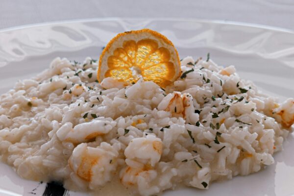 Pompoenrisotto met knapperige paddenstoelen en gefrituurde aubergine